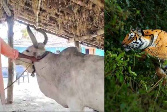 छत्तीसगढ़–महाराष्ट्र सीमा पर बाघ का आतंक: दिन-दहाड़े मवेशी पर हमला, ग्रामीण पेड़ पर चढ़कर बची जान