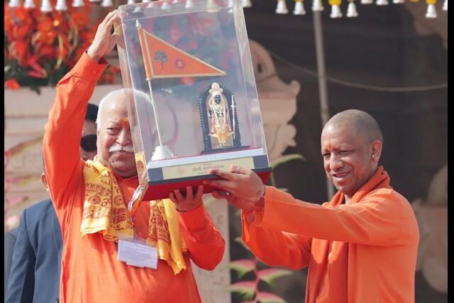 मार्गशीर्ष मास की शुक्ल पक्ष पंचमी यानी विवाह पंचमी के पावन अवसर पर अयोध्या धाम सहित संपूर्ण विश्व प्रभु श्रीराम जन्मभूमि मंदिर के पूर्णत्व का साक्षी बना। इस अवसर पर मंगलवार को श्रीराम जन्मभूमि मंदिर के शिखर पर भगवा ध्वज के आरोहण समारोह में राष्ट्रीय स्वयंसेवक संघ (आरएसएस) के सर संघचालक डॉ. मोहन भागवत ने कहा कि आज हम सबके लिए सार्थकता का दिवस है। उन्होंने कहा कि कितने ही लोगों ने जो सपना देखा, कितने ही लोगों ने जो प्रयास किए, अपने प्राण अर्पित किए, आज उनकी स्वर्गस्थ आत्मा तृप्त हुई होगी। आज वास्तव में अशोक सिंघल जी को शांति मिली होगी। महंत रामचंद्र दास जी महाराज, डालमिया जी समेत कितने ही संत, गृहस्थ एवं विद्यार्थियों ने प्राणार्पण किया, पसीना बहाया। उन्होंने कहा कि जो पीछे रहे, वे भी यही इच्छा व्यक्त करते थे कि मंदिर बनेगा जो अब बन गया है। आज मंदिर निर्माण की शास्त्रीय प्रक्रिया पूर्ण हो गई। ध्वजारोहण भी हो गया। निश्चित तौर पर यह एक ऐतिहासिक व पूर्णत्व का क्षण है। आज का दिन कृतार्थता का दिवस है। आज हमारे संकल्प की पुनरावृत्ति का दिवस है, जिसे हमारे पूर्वजों ने हमें दिया है।