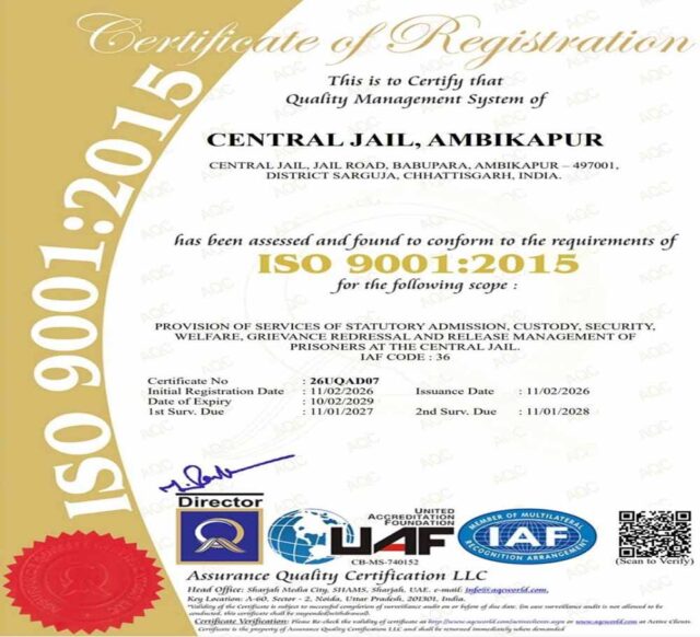 छत्तीसगढ़ की जेल व्यवस्थाओं में गुणवत्ता, पारदर्शिता और जवाबदेही को सुदृढ़ करने की दिशा में एक महत्वपूर्ण उपलब्धि हासिल हुई है। उप मुख्यमंत्री एवं जेल विभाग के प्रभारी मंत्री विजय शर्मा के निर्देशन में राज्य की जेलों की व्यवस्थाओं को बेहतर बनाने के लिए लगातार प्रयास किए जा रहे है। इन्हीं प्रयासों का ही यह परिणाम है कि छत्तीसगढ़ की सेंट्रल जेल रायपुर, दुर्ग, बिलासपुर एवं अम्बिकापुर को अंतरराष्ट्रीय गुणवत्ता मानक आईएसओ 9001ः2015 का प्रमाणन प्राप्त हुआ है।