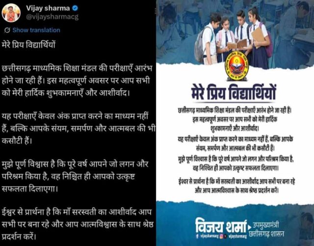 उपमुख्यमंत्री विजय शर्मा ने छत्तीसगढ़ माध्यमिक शिक्षा मंडल की आगामी बोर्ड परीक्षाओं के पूर्व विद्यार्थियों को शुभकामनाएँ दी हैं। उन्होंने अपने एक्स अकाउंट पर विद्यार्थियों को दिए शुभकामना संदेश में सभी परीक्षार्थियों को संबोधित करते हुए कहा कि प्रिय विद्यार्थियों छत्तीसगढ़ माध्यमिक शिक्षा मंडल की परीक्षाएँ आरंभ होने जा रही हैं। इस महत्वपूर्ण अवसर पर आप सभी को मेरी हार्दिक शुभकामनाएँ और आशीर्वाद। यह परीक्षाएँ केवल अंकउ प्राप्त करने का माध्यम नहीं हैं, बल्कि आपके संयम, समर्पण और आत्मबल की भी कसौटी हैं।