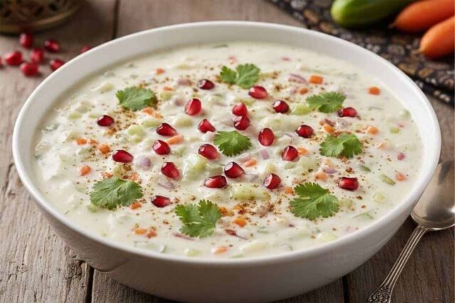 अब इस फेंटे हुए दही में कद्दूकस किया हुआ खीरा और गाजर मिलाएं। साथ ही, बारीक कटा हुआ प्याज और टमाटर भी डाल दें।